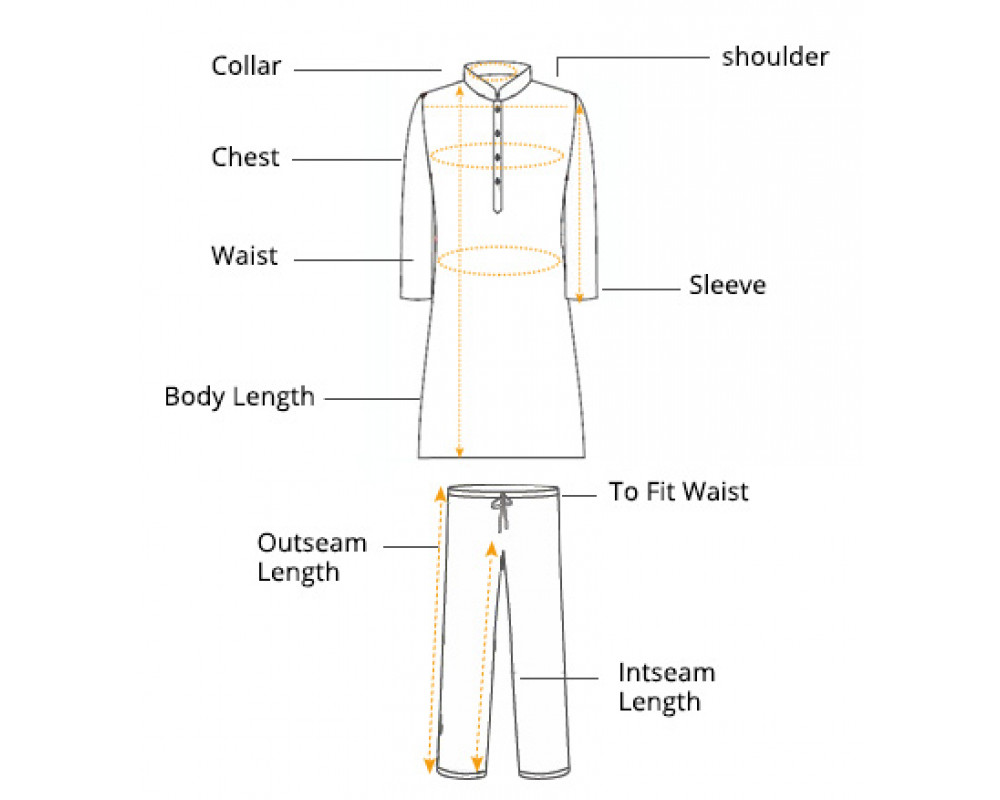 Kurta shirt length around 33 inches. Chest size is 39 Inches. Pajama length is 40 Inches. Thigh size is 12 Inches.