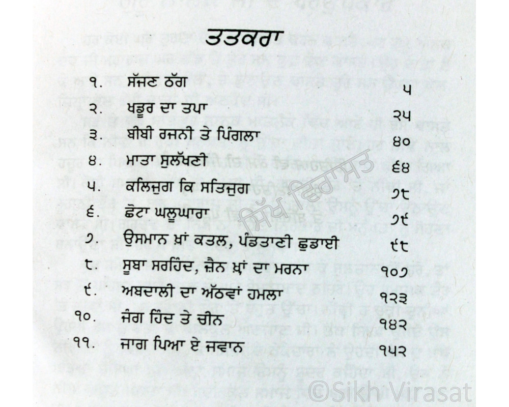 ਇਸ ਪੁਸਤਕ ਵਿਚ ਜੰਗ ਚਮਕੌਰ ਸਾਹਿਬ, ਜੰਗ ਮੁਲਤਾਨ, ਸ਼ਹੀਦੀ ਅਕਾਲੀ ਫੂਲਾ ਸਿੰਘ ਜੀ, ਜੰਗ ਕਸੂਰ, ਆਜ਼ਾਦ ਭਾਰਤ ਦੀ ਪਹਿਲੀ ਫ਼ਤ..