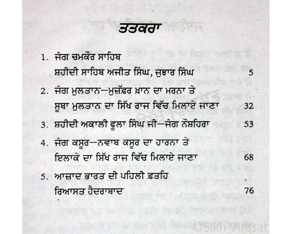 This book contains detailed description of historical events such as, Jang Chamkaur Sahid, Jang Multan, Shahidi Akali Foola Singh Ji, Jang Kasur, Azad Bharat di pehli feteh etc.