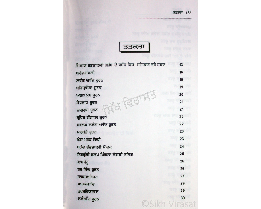 ਇਹ ਪੁਸਤਕ ਅੱਜ ਤੋਂ ਕਈ ਸੌ ਸਾਲ ਪਹਿਲਾ ਦੇ ਹੱਥ-ਲਿਖਤ ਗ੍ਰੰਥ ਦਾ ਅਨੁਵਾਦ ਕੀਤਾ ਹੋਇਆ ਸਰੂਪ ਹੈ। ਇਸ ਕਿਤਾਬ ਵਿੱਚ ਅਨੇਕਾਂ ਤਰਾਂ ਦੇ ਆਯੁਰਵੈਦਿਕ ਚੂਰਨ ਅਤੇ ਅੰਮ੍ਰਿਤ ਬਣਾਉਣ ਦੀ ਵਿਧੀ ਦੇ ਨਾਲ-ਨਾਲ ਉਨ੍ਹਾਂ ਦੇ ਲਾਭ ਦਰਜ ਹਨ।