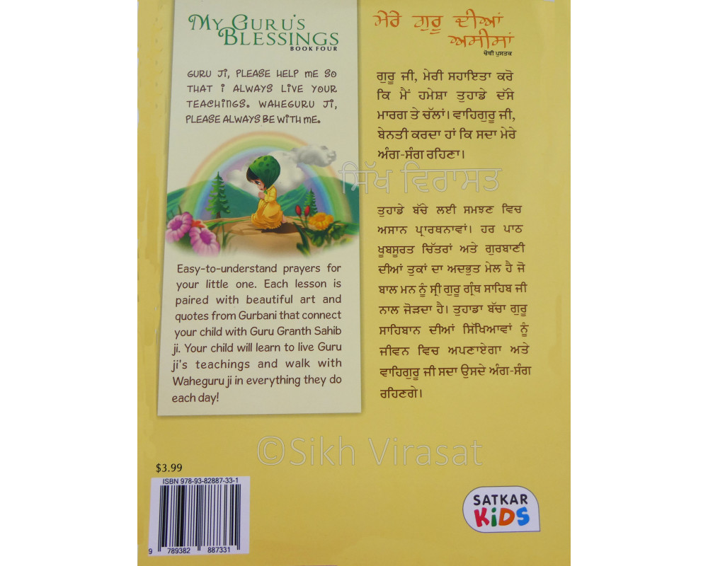 Easy-to-understand prayers for your little one. Every story and lesson is paired with beautiful pictorial art and quotes from Gurbani that connect your child more with the Shri Guru Granth Sahib ji and Sikhi. Your child will learn to live Guru ji's teachings and walk with Waheguru ji in everything they do each day and hence understand sikh faith and embrace it .