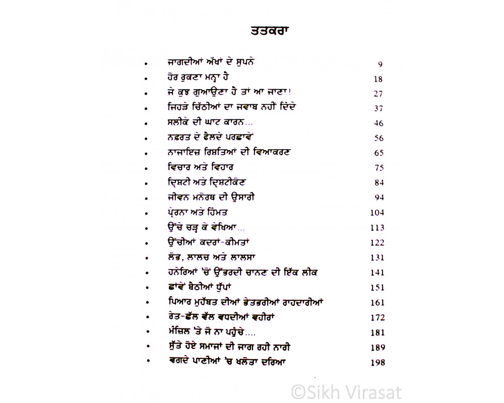 ਇਹ ਪੁਸਤਕ 21 ਲੇਖਾਂ ਦੀ ਸੰਗ੍ਰਹਿ ਹੈ । ਇਸ ਸੰਗ੍ਰਹਿ ਵਿਚਲੇ ਲੇਖ, ਨਿਮਰਤਾ ਸਹਿਤ, ਰੁਕਿਆਂ ਹੋਇਆਂ ਨੂੰ ਚੱਲਣ ਦਾ ਸੁਨੇਹਾ ਹਨ ਅਤੇ ਜਾਗਦਿਆਂ ਨੂੰ ਅੱਖਾਂ ਖੋਲ੍ਹ ਕੇ ਸੁਪਨੇ ਵੇਖਣ ਦੀ ਦਾਅਵਤ ਹਨ ।