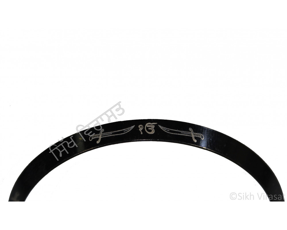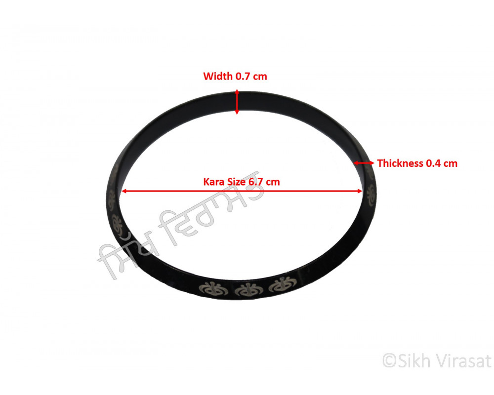 This Kara ranges from 6.2 cm to 6.7 cm in Diameter. It is made of premium quality stainless steel which is covered with an attractive black color coating which again has Khandas and EK ONKAR Printed on it. It is 0.7 cm wide and 0.4 cm thick, which gives it a nice weight around 21 gm.