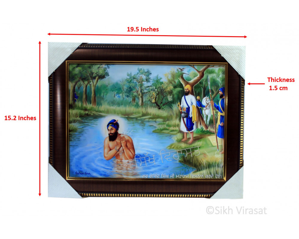 Shri Guru Gobind Singh Ji While Taking a Bath Photo, Wooden Frame with Attractive golden pattern, Size – 12x16