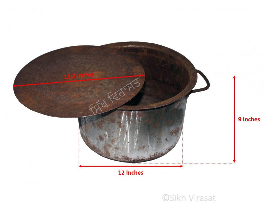 This Iron (Sarabloh) Patila has a diameter of 12 Inches and height of 9 Inches. It comes with a lid/cover which has a diameter of 13.3 inches.