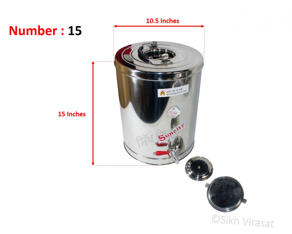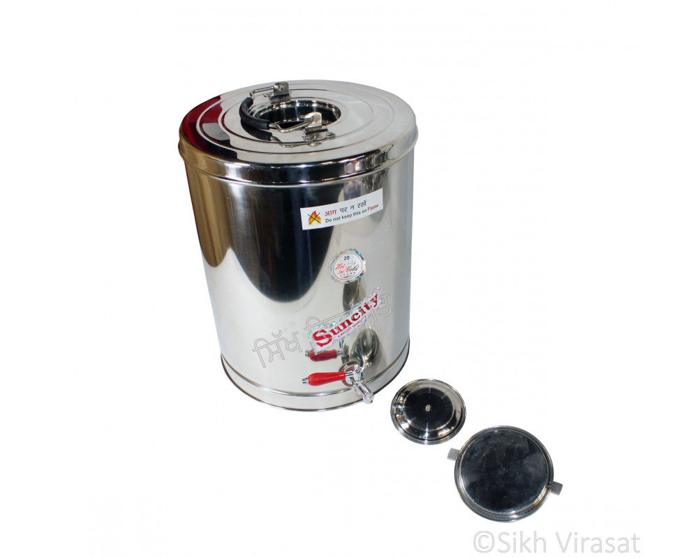 The Large 20 Liters version can hold up to 20 liters of tea. It is 15.5 Inches tall and has a diameter of 12.5 Inches. It is best suitable for dispensing tea to a large number of people such as in a marriage or langar.