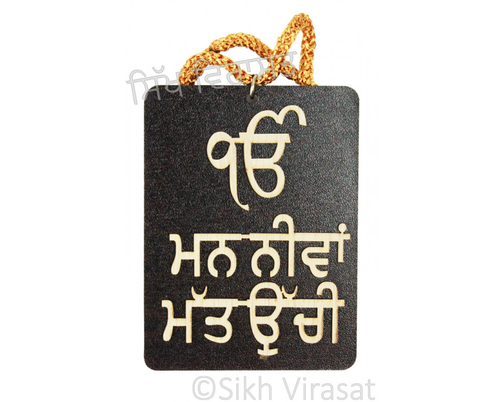 wood which has both sides ਮਨ ਨੀਵਾਂ ਸੱਤ ਉੱਚੀ (Maan Neeva Maat Uchi) With Ik Onkar text cut of the car hanging with golden