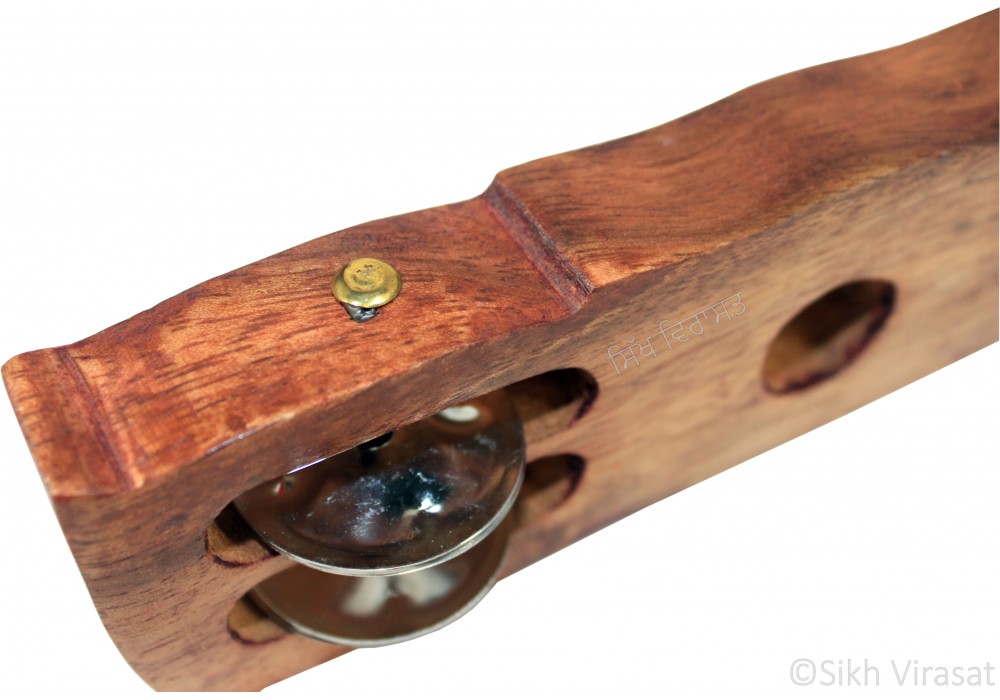Kahrtal comprises two similar shaped wooden pieces. Small round brass prices are affixed over these wooden pieces. One of the pieces has a space for the thumb and the other to hold four fingers. khartal is played by the same hand.