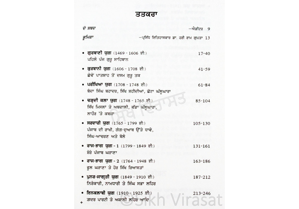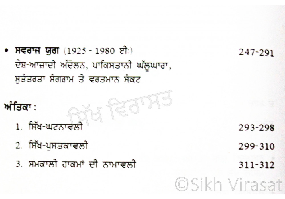 10 ਅਧਿਆਇ ਦੇ ਇਸ ਸੰਗ੍ਰਹਿ ਵਿਚ ਲੇਖਕ ਨੇ ਗੁਰੂ-ਕਾਲ ਦੇ ਸਿੱਖ ਸਿਧਾਂਤਾ, ਸਿੱਖ ਸ਼ਹੀਦੀਆਂ, ਸਿੱਖ ਮਿਸਲਾਂ ਤੇ ਅਬਦਾਲੀ, ਮਹਾਰਾਜਾ ਰਣਜੀਤ ਸਿੰਘ ਜੀ ਦੀ ਇਤਿਹਾਸਕ ਘਾਲ ਤੇ ਸਿੱਖ ਰਾਜਿਆਂ ਅਤੇ ਵੀਹਵੀਂ ਸਦੀ ਦੇ ਹਾਲਾਤ ਦਾ ਵਰਨਣ ਕੀਤਾ ਹੈ । ਪੁਸਤਕ ਦੇ ਅੰਤ ਵਿਚ ਸਿੱਖ-ਇਤਿਹਾਸ ਦੀਆਂ ਅਹਿਮ ਘਟਨਾਵਾਂ, ਪੁਸਤਕਾਂ, ਸੰਪ੍ਰਦਾਵਾਂ ਤੇ ਸਮਕਾਲੀ ਹਾਕਮਾਂ ਦੇ ਨਾਮਾਵਲੀ ਜੋੜੀ ਗਈ ਹੈ । ਇਹ ਸਿੱਖ ਇਤਿਹਾਸ ਦਾ ਆਲੋਚਨਾਤਮਿਕ ਅਧਿਐਨ ਹੈ ਜੋ ਪੰਜਾਬ ਇਤਿਹਾਸ ਦੇ ਵਿਦਿਆਰਥੀਆਂ ਲਈ ਬੜਾ ਹੀ ਲਾਭਦਾਇਕ ਤੇ ਬਹੁਮੁੱਲਾ ਹੈ ।