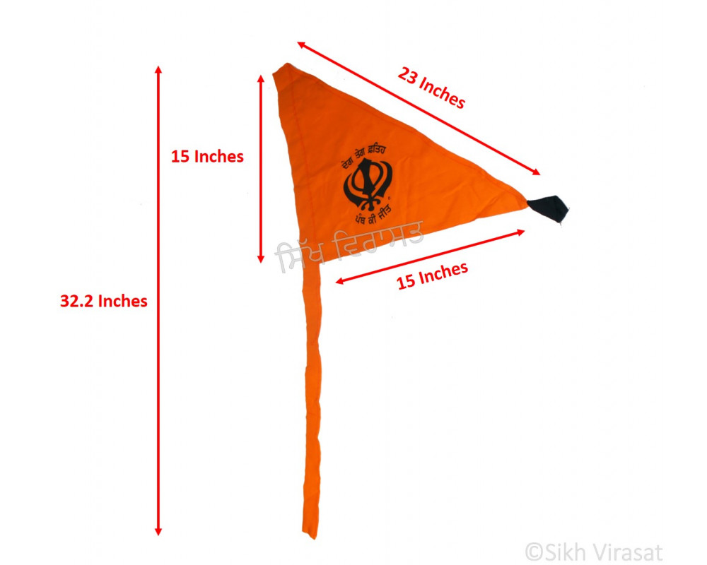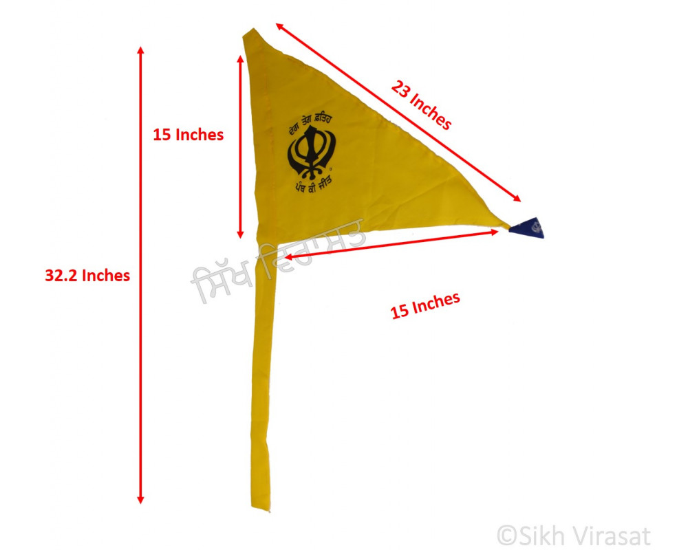We offer this Nishan Sahib or Printed Flag in two colors namely, Orange (kesri) & Yellow. The flag is 32.2 Inches Tall and 15 Inches Wide, covering the diagonal distance of 23 Inches.